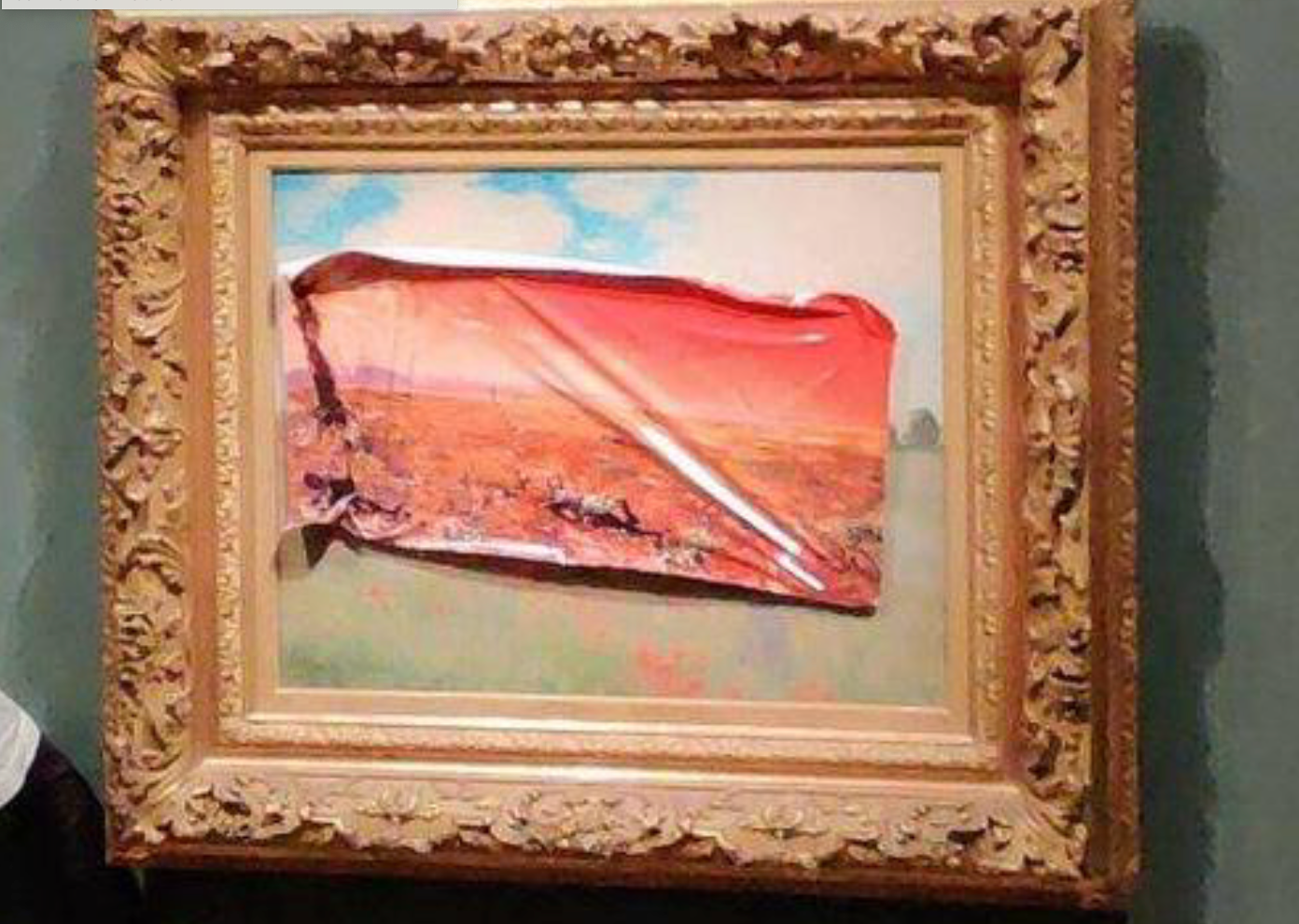 La obra intervenida fue el «Campo de amapolas» de Claude Monet, colocándole un cartel que mostraba un paisaje similar al de la pintura con un aspecto más apocalíptico, sin embargo, dicha obra tiene un vidrio de protección por lo que la obra no resultó con daños.