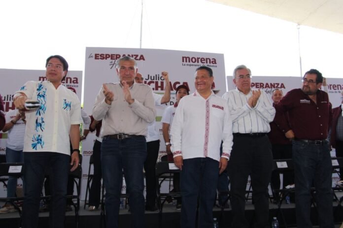 En el acto proselitismo, Menchaca Salazar estuvo acompañado del secretario de Gobierno de México, Adán Augusto López, del gobernador de Sinaloa Rubén Rocha Moya, del presidente nacional de Morena Mario Delgado Carrillo, así como senadoras y senadores, diputadas y diputados federales y estatales.