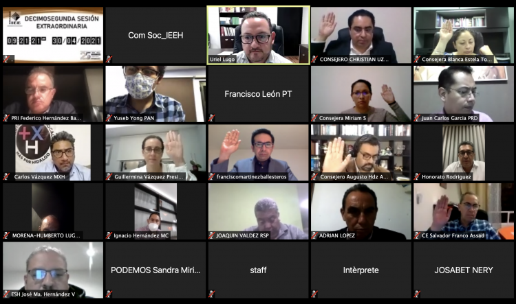 El Instituto Estatal Electoral de Hidalgo (IEEH) aprobó, durante la décimo tercera Sesión Extraordinaria del Consejo General para el mes de abril, la ampliación del periodo de registro para Observadoras y Observadores Electorales para los Procesos Electorales Locales en curso, también aprobó sustituciones a los Partidos Redes Sociales Progresistas y Podemos, además de una candidatura en reserva para Más por Hidalgo y canceló el registro de una candidatura en Huichapan.