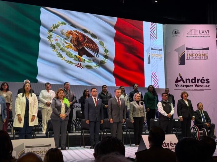 El diputado Andrés Velázquez Vázquez, presidente de la Junta de Gobierno del Congreso de Hidalgo, presentó su primer informe de actividades, acompañado por la presidenta del DIF Hidalgo, Edda Vite Ramos; la magistrada presidenta del Tribunal Superior de Justicia, Rebeca Amadeo Echeverría; y el gobernador Julio Menchaca Salazar.