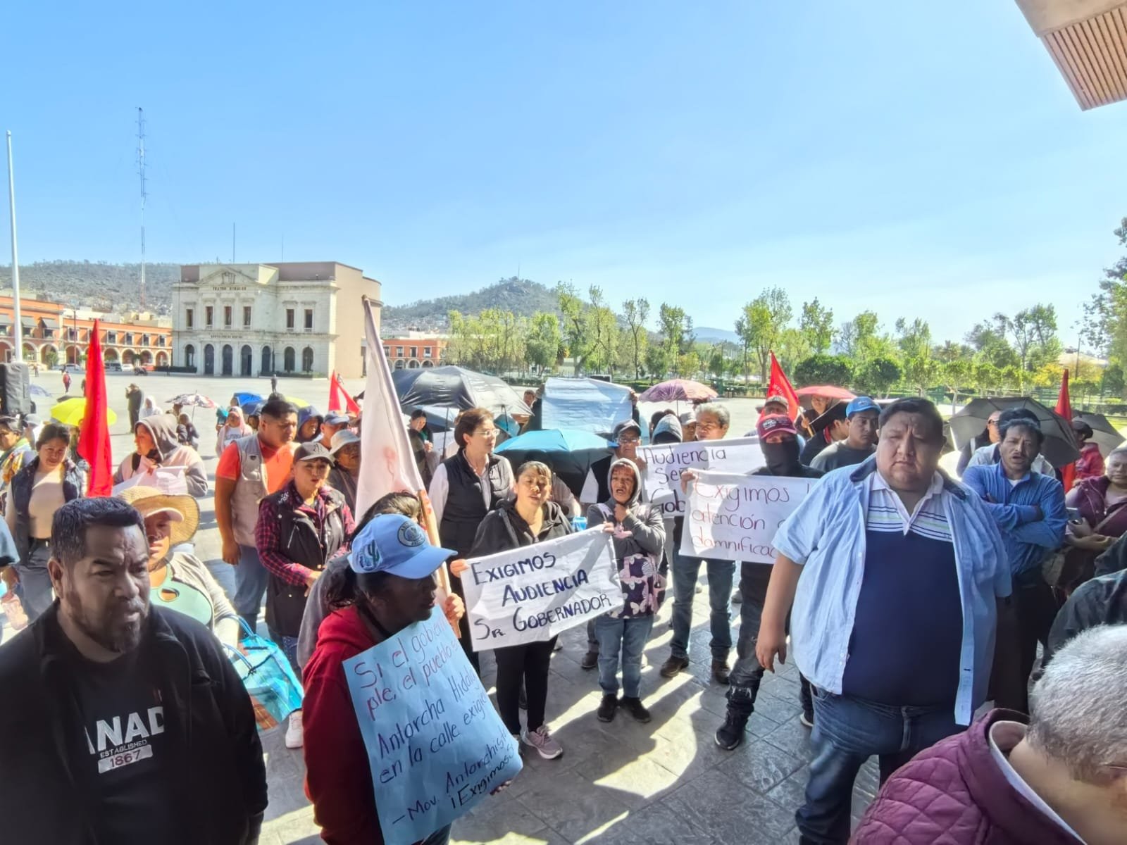 Decenas de integrantes del Movimiento Antorchista Hidalguense, encabezados por su dirigente Guadalupe Orona, se manifestaron este miércoles frente a Palacio de Gobierno para exigir el cumplimiento de acuerdos relacionados con escrituración, obras públicas y servicios básicos en colonias y comunidades marginadas del estado.