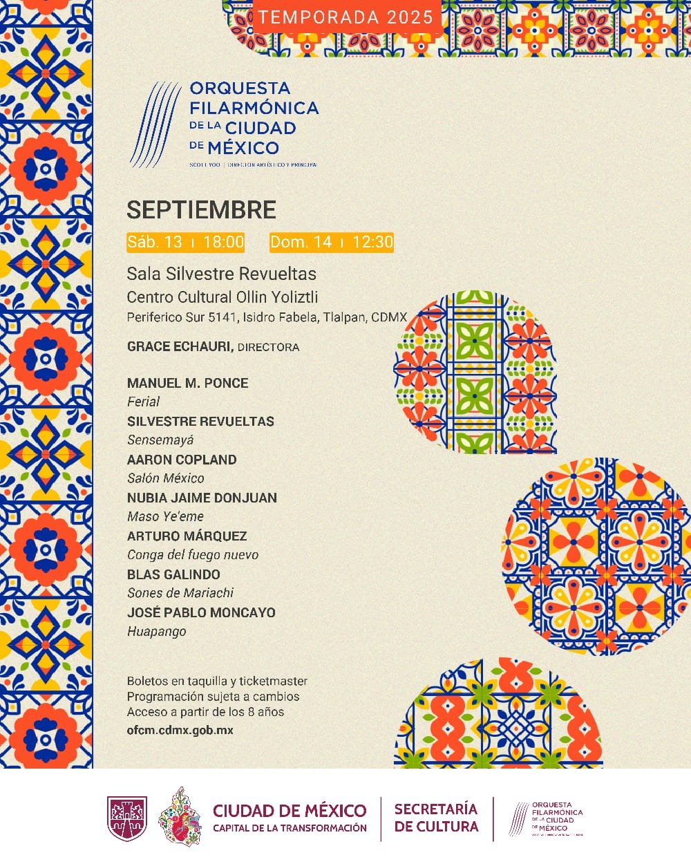 El ciclo iniciará con un concierto de música mexicana para conmemorar las fiestas patrias, bajo la batuta de la directora invitada Grace Echauri, con obras de Manuel M. Ponce, Silvestre Revueltas, Nubia Jaime Donjuan, Arturo Márquez, Blas Galindo y José Pablo Moncayo, además de “Salón México” de Aaron Copland.
