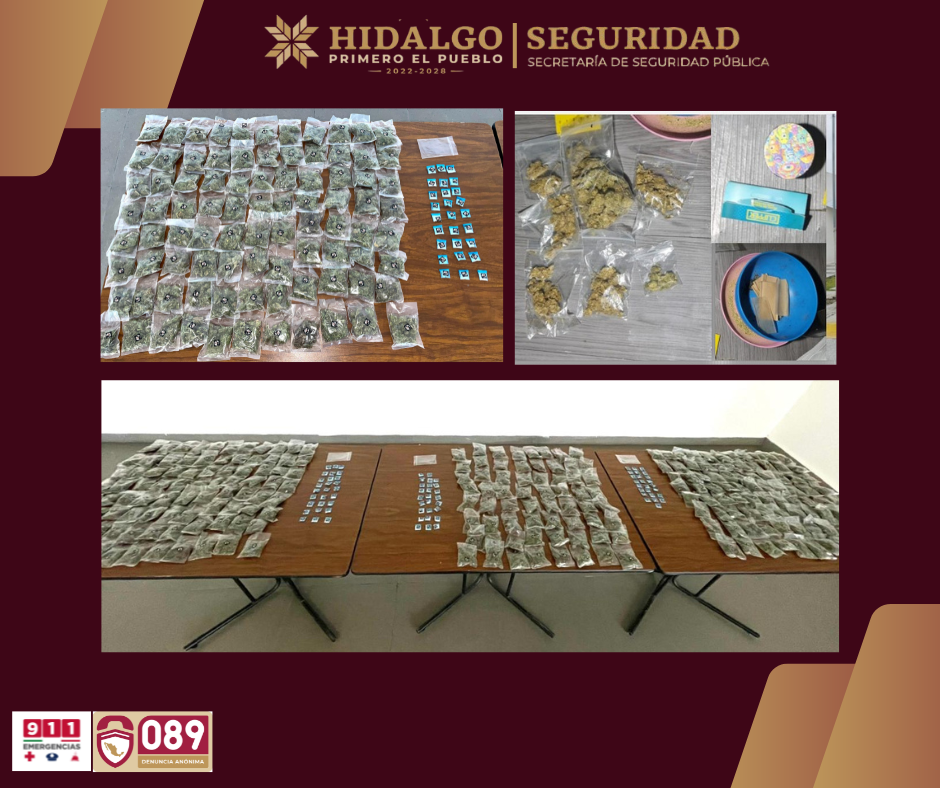 En Tula de Allende, derivado del despliegue operativo en la región, fueron asegurados tres hombres, dos de 34 años y uno de 47, quienes se encontraban en posesión de 800 dosis de hierba verde con características de marihuana y 260 dosis de presunto cristal. Durante estas acciones también fue asegurada una camioneta Mazda con reporte de robo vigente, la cual quedó a disposición de la autoridad competente.