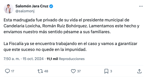 “Consternados con el crimen en contra del presidente municipal. El H. Ayuntamiento de Candelaria Loxicha con profunda tristeza anuncia el cobarde asesinato de nuestro amigo, compañero y presidente municipal, el profesor Román Ruiz Bohórquez”, comunicó el Gobierno Municipal.