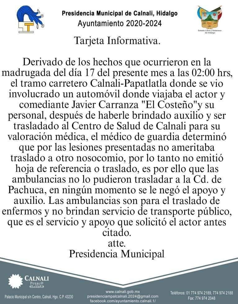 La Presidencia Municipal de Calnali, Hidalgo, emitió un comunicado en respuesta a los comentarios realizados por el actor y comediante Javier Carranza «El Costeño», quien sufrió un incidente automovilístico en el tramo carretero Calnali-Papatlatla, tras regresar del municipio de Atlapexco donde ofreció una presentación.