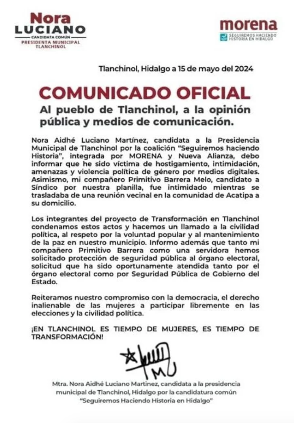 Las jornadas electorales han sido motivo de violencia política, sin embargo ha prevalecido en relación a la violencia política de género, además de buscar la manera «fácil» de detener las contiendas electorales de cualquier candidata o candidato que resulte superior a otros. Ante este hecho la candidata emitió un comunicado exigiendo detener la violencia política contra las mujeres.