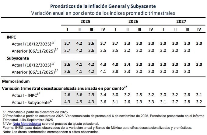 En el ámbito nacional, Banxico destacó que la actividad económica se ha mantenido débil y que persisten riesgos a la baja derivados de la incertidumbre global. Entre octubre y noviembre, la inflación general pasó de 3.63 a 3.80%, mientras que la subyacente aumentó de 4.24 a 4.43%, impulsada principalmente por el encarecimiento de mercancías no alimenticias. Aun así, se mantiene la expectativa de que la inflación converja a la meta de 3% en el tercer trimestre de 2026.