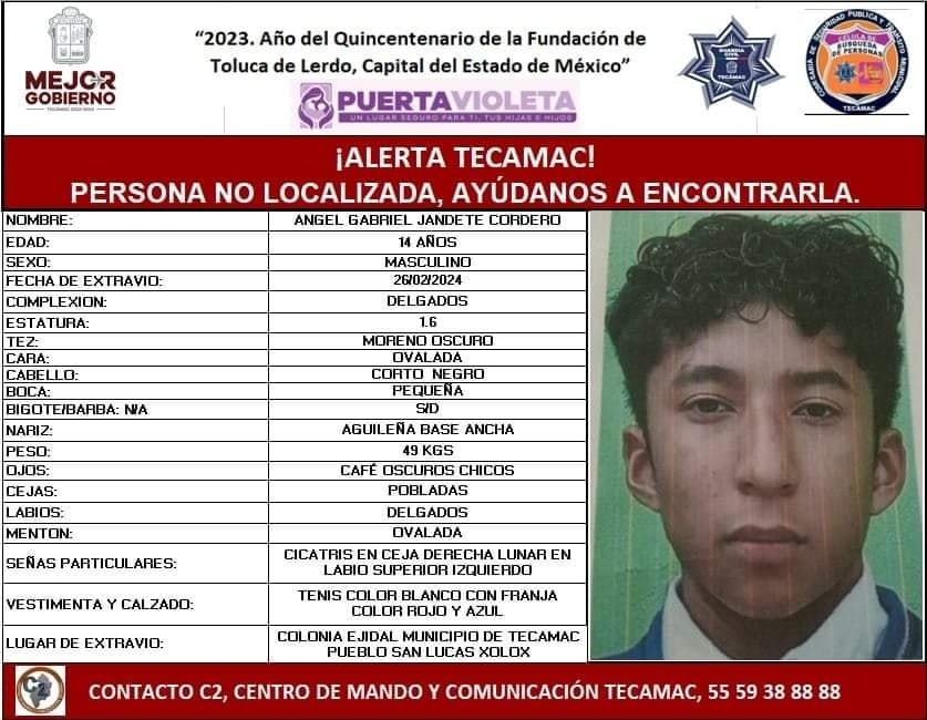 El joven, de 1.60 metros de estatura, cabello negro y chino, fue visto por última vez en la madrugada del 26 de febrero en la Colonia Ejidal, San Lucas Xolox, Tecámac, Estado de México.