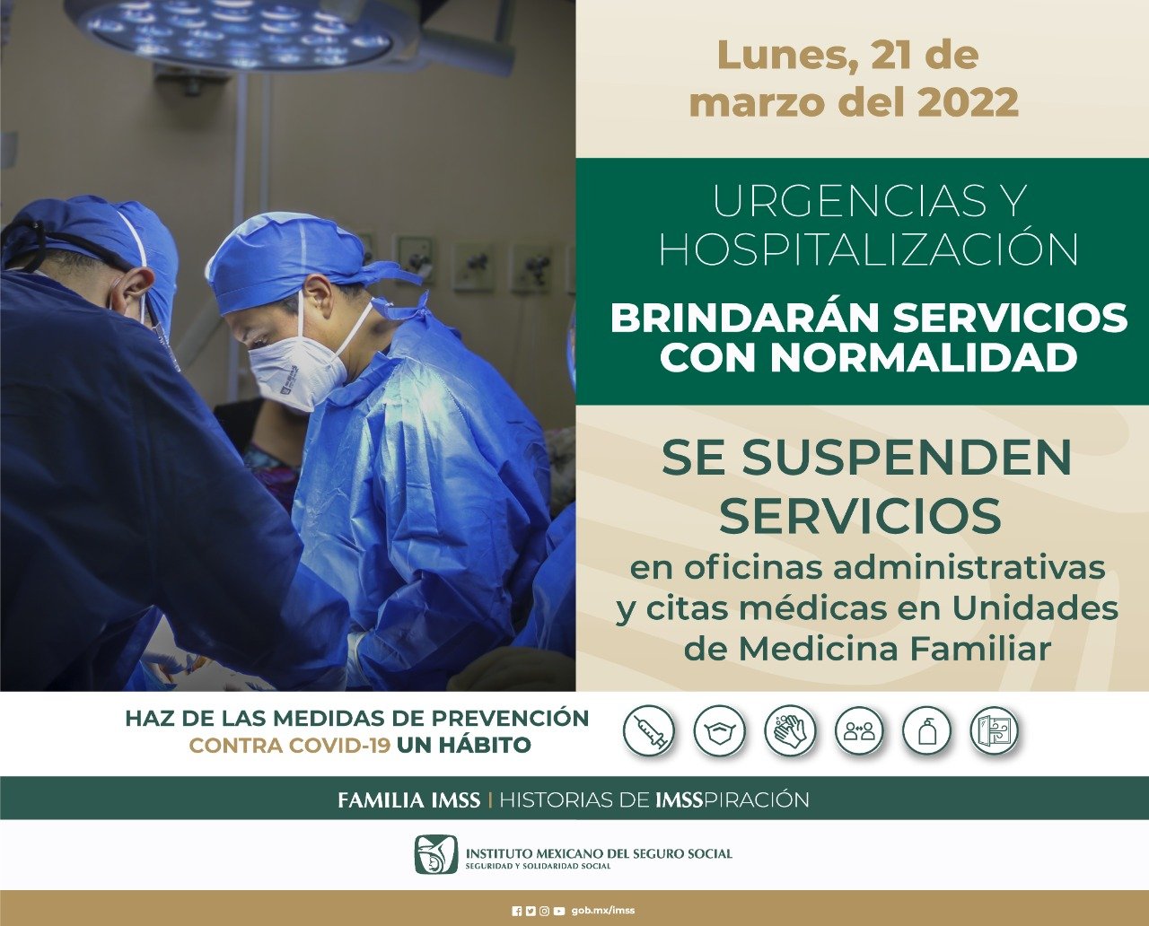 El Instituto Mexicano del Seguro Social informó que los Servicios de Atención Médica Continua y Urgencias operarán de manera normal durante el puente del próximo lunes 21 de marzo del 2022.