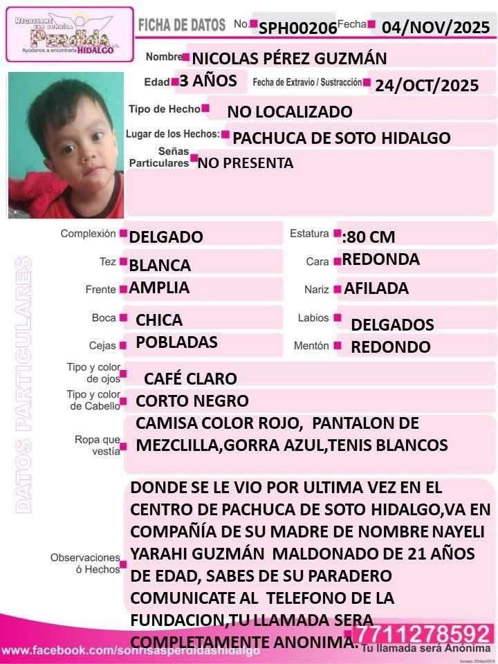 La organización Sonrisas Perdidas Hidalgo emitió fichas de búsqueda para Nayeli Yarahí Guzmán Maldonado, de 21 años, y su hijo Nicolás Pérez Guzmán, de tres años de edad, quienes fueron vistos por última vez el 24 de octubre de 2025 en el centro de Pachuca de Soto.