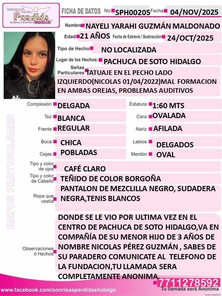 La organización Sonrisas Perdidas Hidalgo emitió fichas de búsqueda para Nayeli Yarahí Guzmán Maldonado, de 21 años, y su hijo Nicolás Pérez Guzmán, de tres años de edad, quienes fueron vistos por última vez el 24 de octubre de 2025 en el centro de Pachuca de Soto.