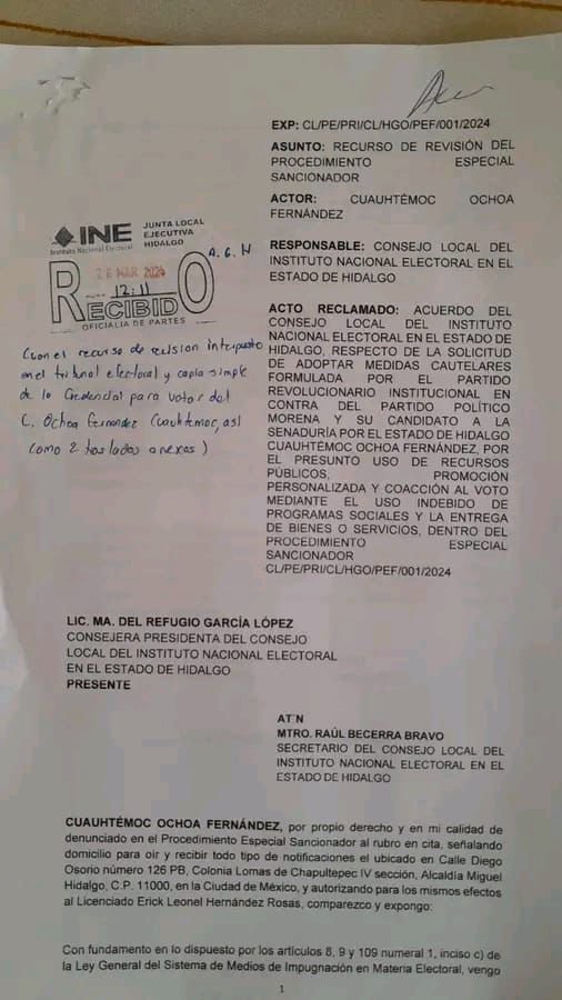 El equipo jurídico del candidato al Senado de la República, Cuauhtémoc Ochoa Fernández, impugnó la medida cautelar ante el Tribunal Electoral del Poder Judicial de la Federación (TEPJF), que se le dictó por el supuesto uso de los programas sociales durante su campaña política rumbo a los comicios del 2 de junio.