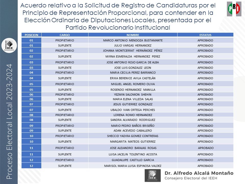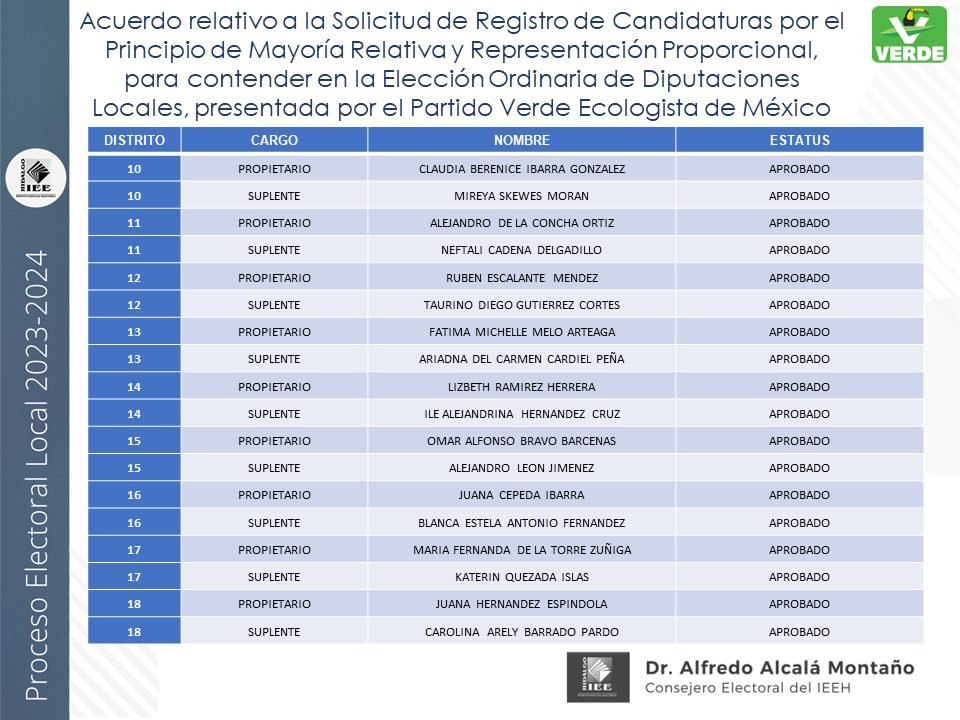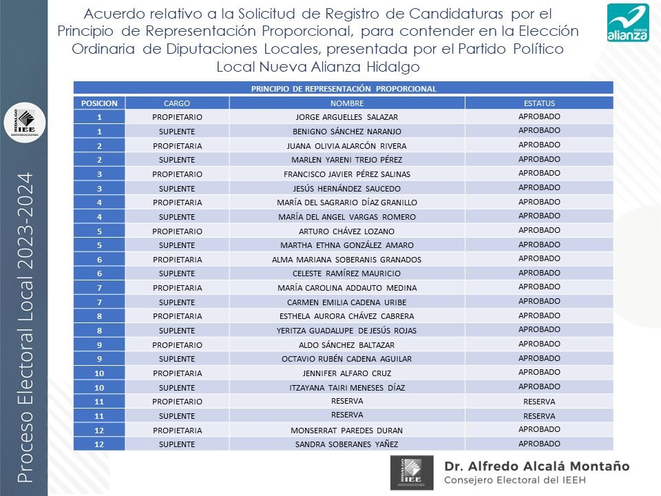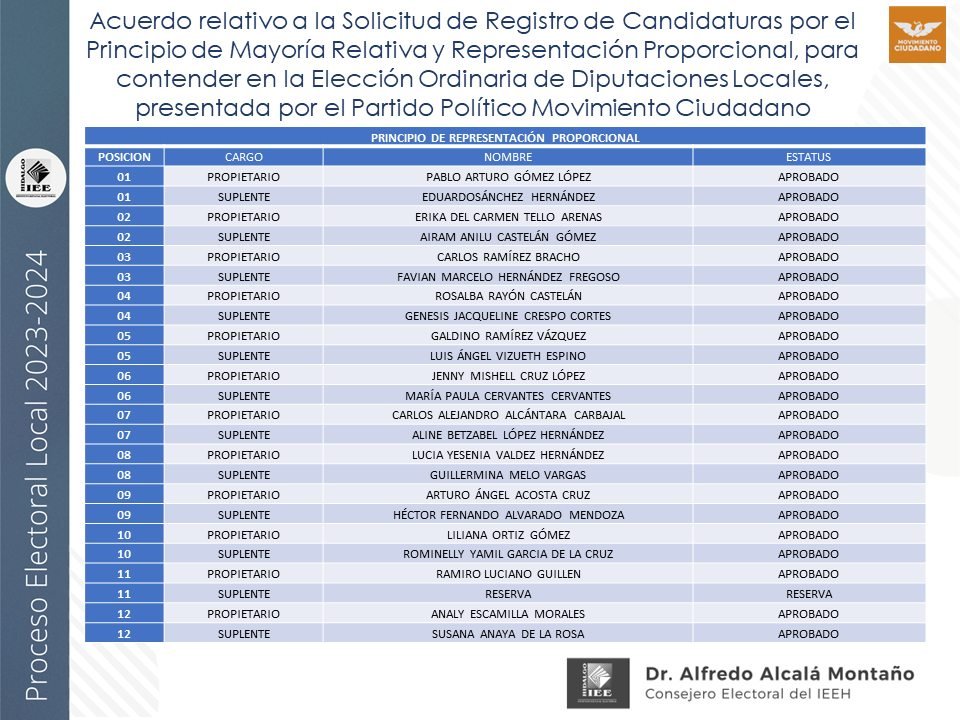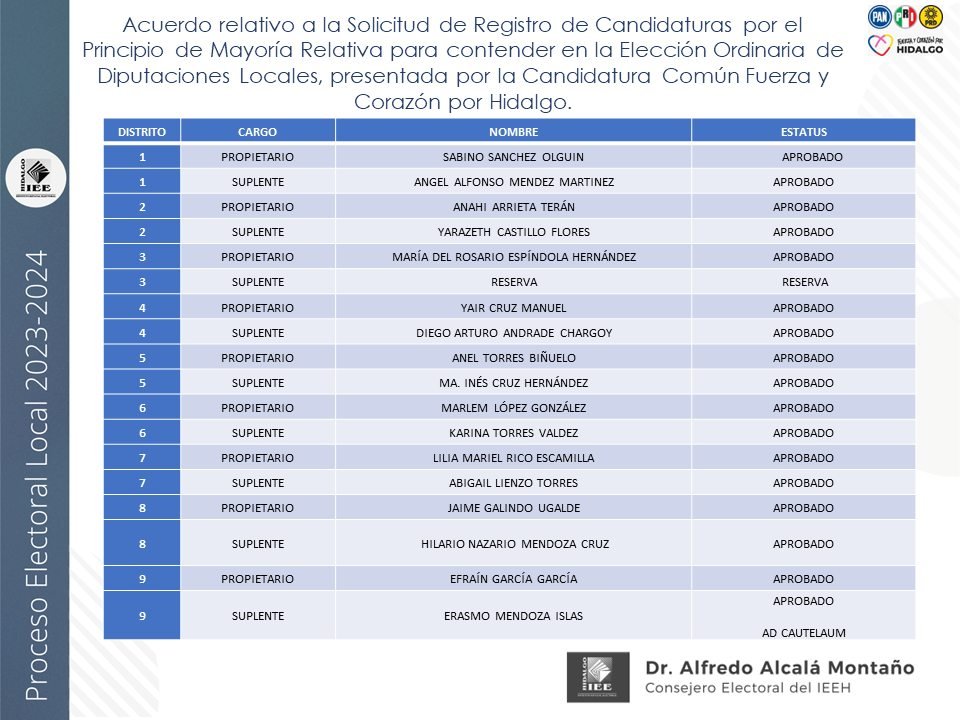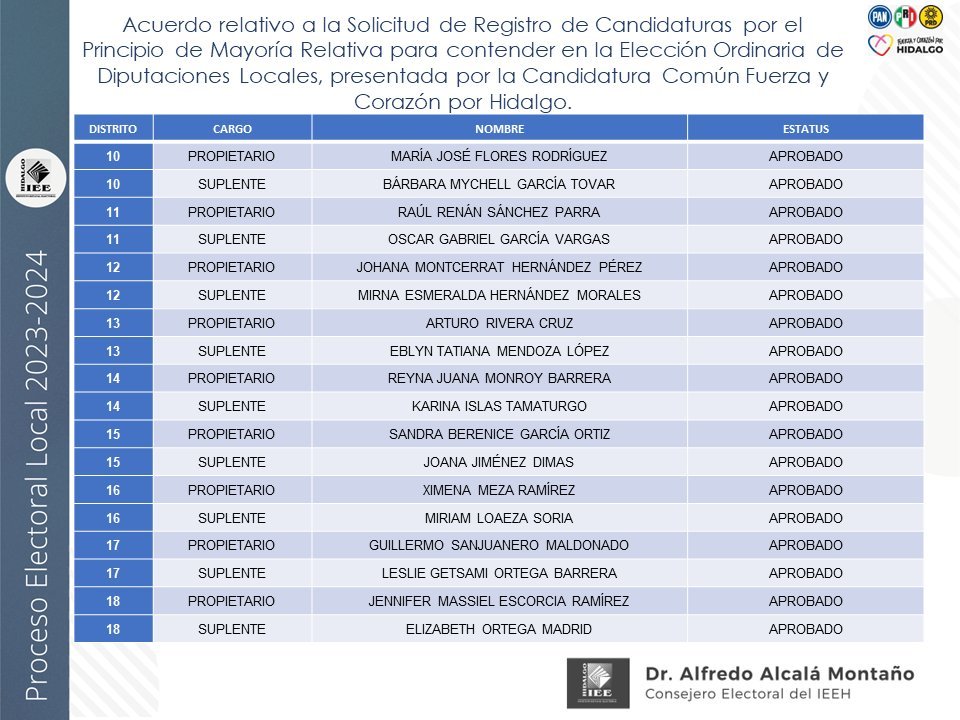 Candidaturas a diputaciones locales, aprobadas por el IEEH, por el Principio de Mayoría Relativa y Representación Proporcional para el distrito XII Pachuca