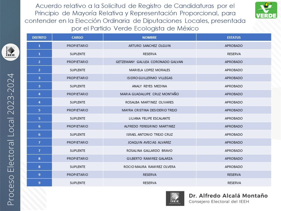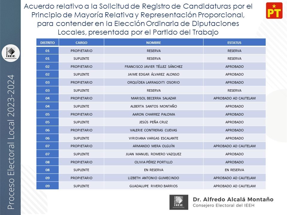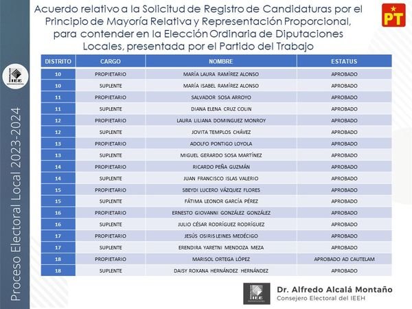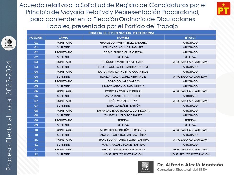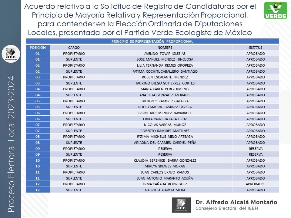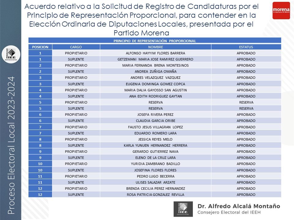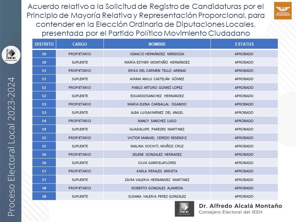 Candidaturas a diputaciones locales, aprobadas por el IEEH, por el Principio de Mayoría Relativa y Representación Proporcional para el distrito XII Pachuca
