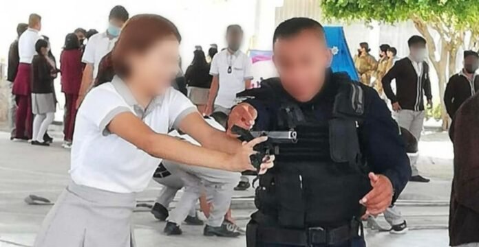 15 de julio de 2022.- Organizaciones civiles denunciaron que policías de Purísima del Rincón, Guanajuato, realizaron una capacitación en una escuela secundaria en donde les dieron armas a los estudiantes.