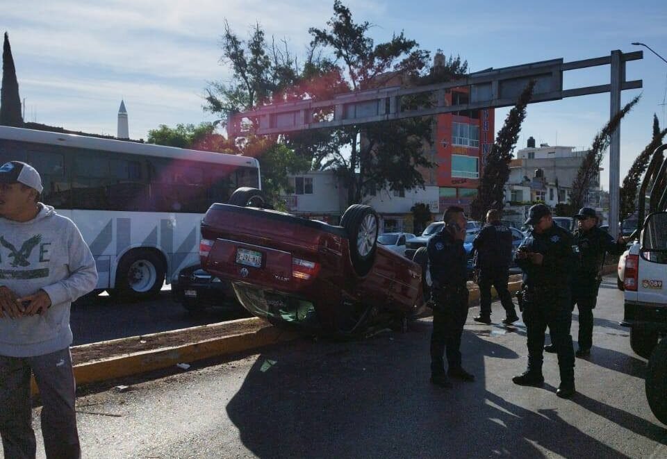 El accidente se registró a la altura de la tienda de autoservicios Bodega Aurrera, cuando un vehículo color rojo se volcó sobre el camellón central, provocando que dos camionetas más se impactaran.