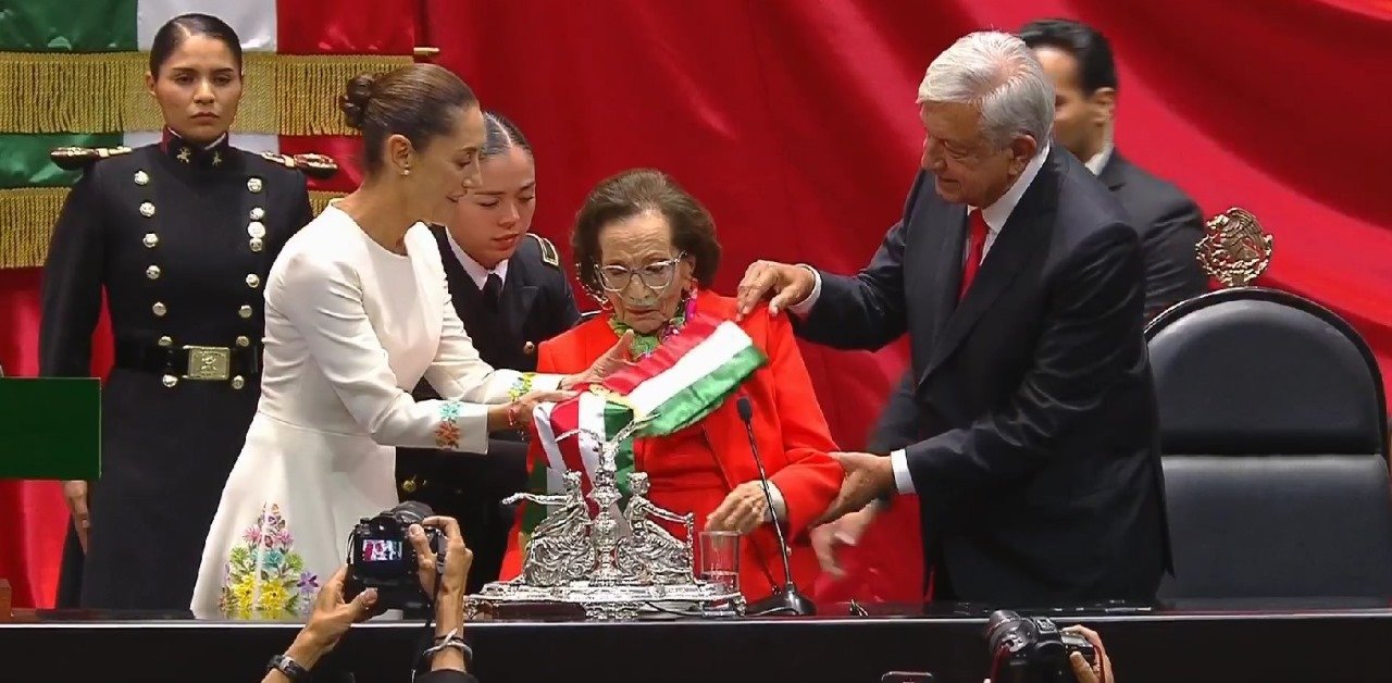 Entre aplausos y festejos para Claudia y un firme «Viva México», pasaron los segundos mientras Ifigenia Martínez se lograba incorporar para recibir la Banda Presidencial de manos del ahora expresidente Andrés Manuel López Obrador, y luego pasársela a la presidenta.