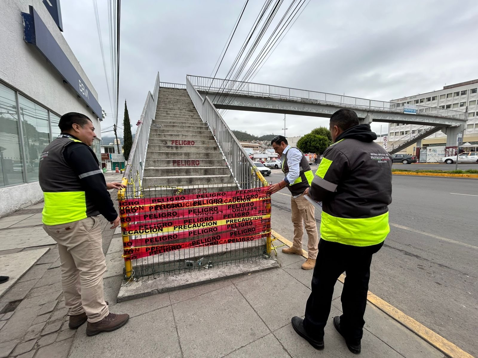 Personal de la Subsecretaría de Protección Civil y Gestión de Riesgos del Estado de Hidalgo colocó sellos de clausura en el puente peatonal ubicado sobre la carretera Pachuca-Tulancingo, colonia Ciudad de los Niños, frente al Hospital General de Pachuca, debido al riesgo inminente de colapso que representa para los transeúntes.