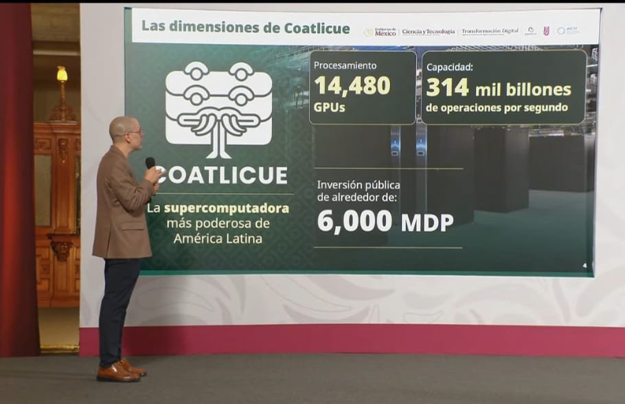 José Antonio Peña Merino, titular de la ATDT, explicó que una supercomputadora es un sistema con miles de procesadores que trabajan de manera simultánea para resolver problemas complejos. Detalló que Coatlicue contará con 14 mil 480 GPUs y podrá realizar 314 mil billones de operaciones por segundo, lo que representa siete veces más capacidad que la supercomputadora más grande de la región, actualmente en Brasil.