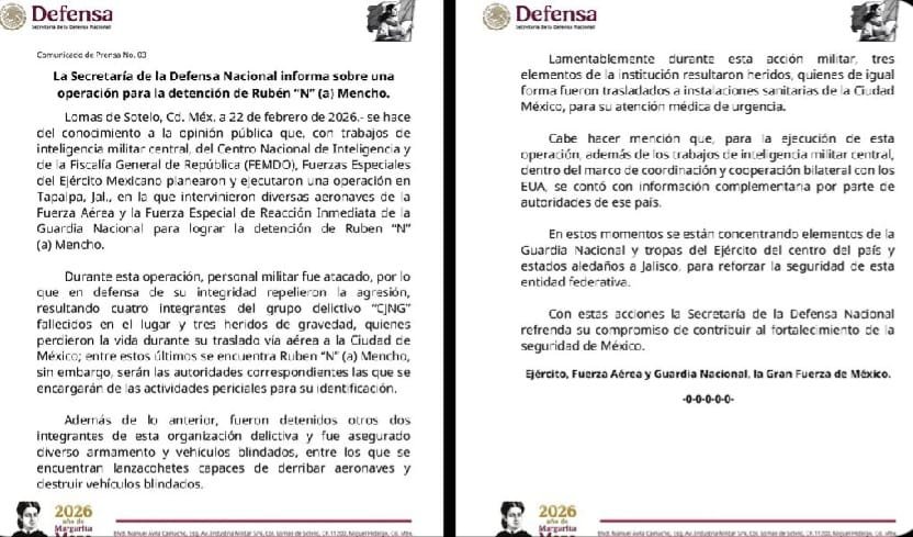 La Secretaría de la Defensa Nacional (Sedena) informó sobre la ejecución de una operación para la detención de Rubén “N”, (Nemesio Oseuera Cervantes) alias “El Mencho”, realizada en el municipio de Tapalpa, Jalisco, mediante trabajos coordinados de inteligencia militar central, el Centro Nacional de Inteligencia (CNI) y la Fiscalía General de la República, a través de la FEMDO.