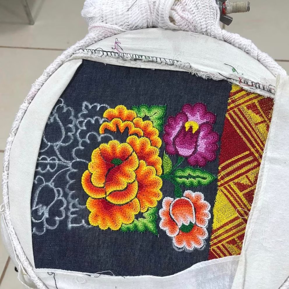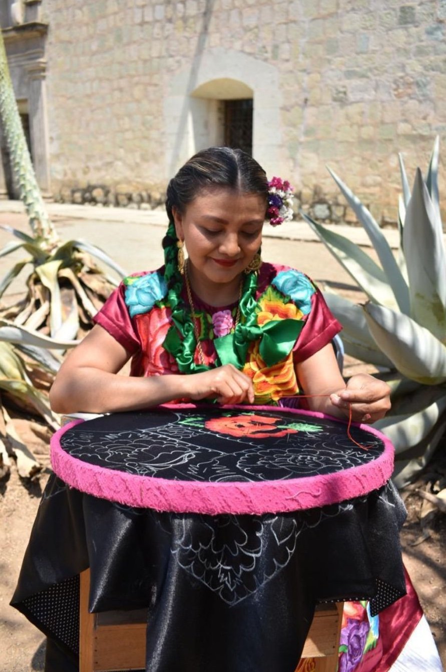 Originaria de Santa María Xadani, Vásquez Aquino se dedica a la elaboración de textiles del Istmo de Tehuantepec, la artesana dibuja sus propios diseños, realiza los trazos y el bordado.