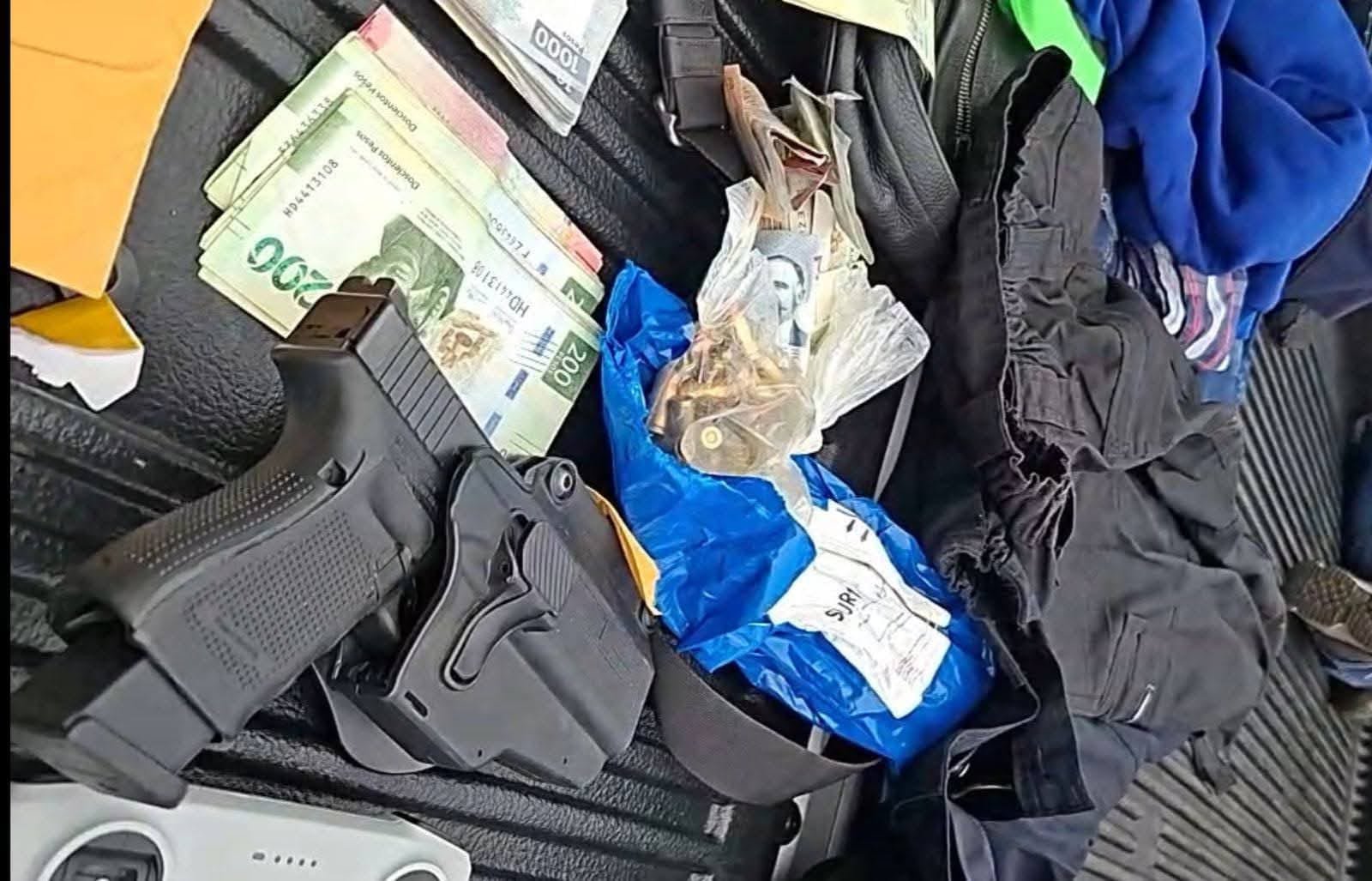 Los elementos de la policía aseguraron cartuchos, droga, cerca de 50 mil pesos en efectivo, ropa táctica, un dron y un sistema de internet satelital, además de un arma corta encontrada en el vehículo en el que viajaban.