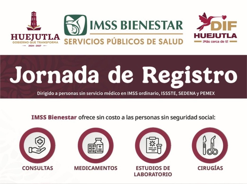 Con el objetivo de acercar servicios de salud y seguridad social a la población, el Sistema DIF Huejutla y el Gobierno Municipal anunciaron la Jornada de Registro IMSS-Bienestar y Vacunación, dirigida a personas que no cuentan con derechohabiencia en IMSS ordinario, ISSSTE, Sedena o PEMEX.