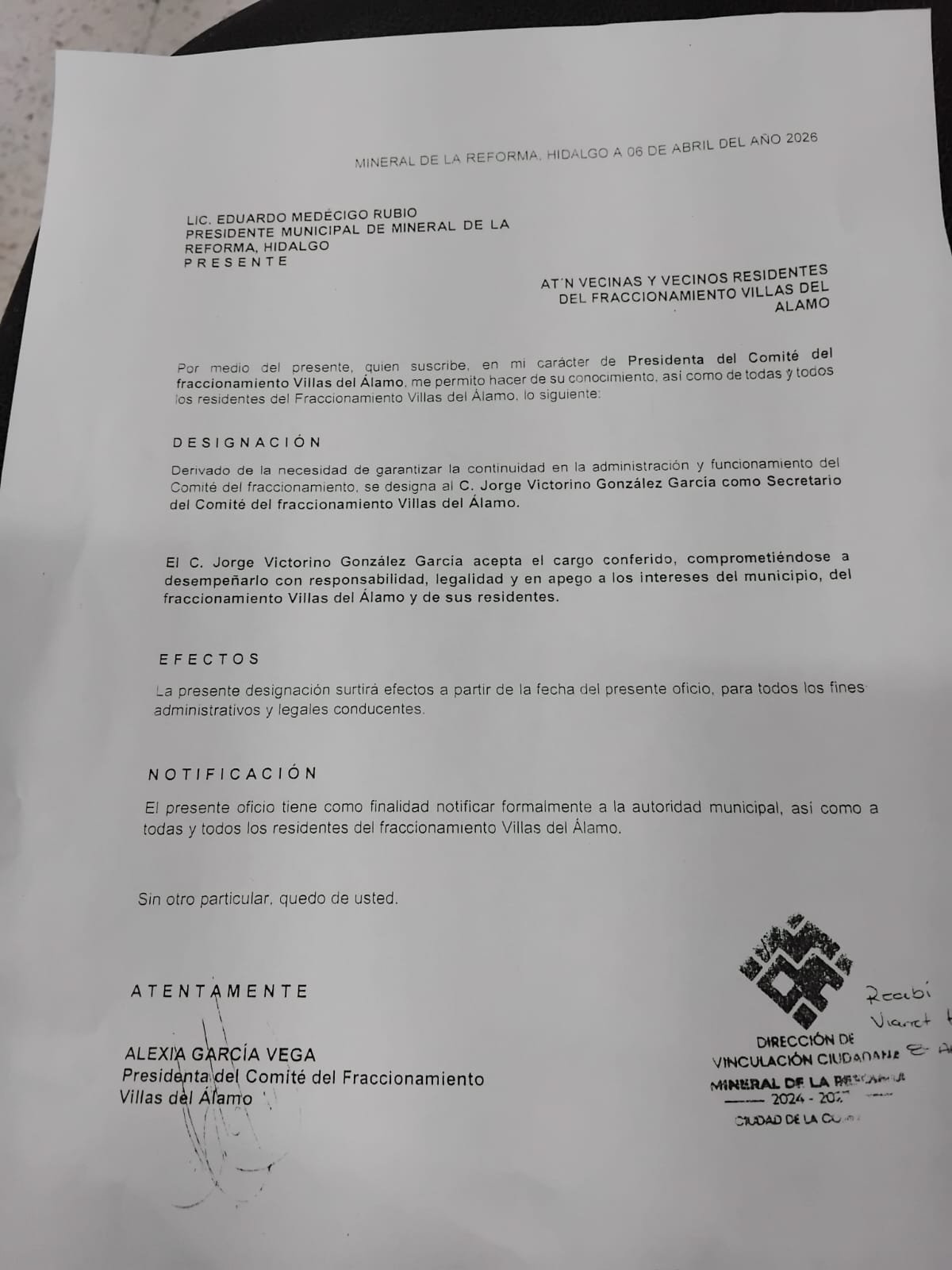 Se destacó que Alexia García Vega presentó un documento donde ella, en calidad de presidenta del comite de Villas del Alamo hace el nombramiento de Victorino González García como secretario del comité del fraccionamiento, el cual fue recibido por el Director de Vinculación Ciudadana del municipio de Mineral de la Reforma Ángel Pérez Trejo, ante lo cual se subrayó que por reglamento no cuenta con esa facultad de otorgar nombramientos.