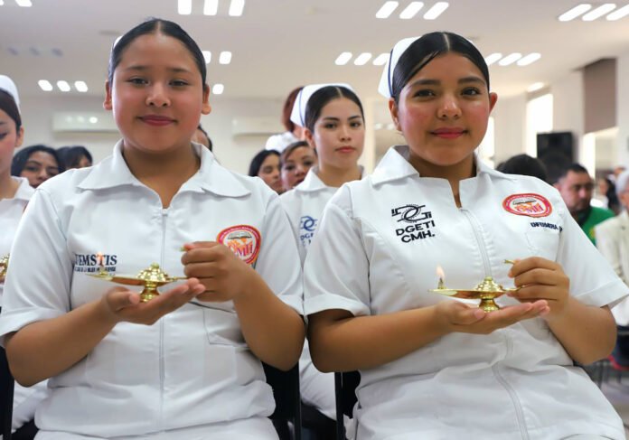 Durante la ceremonia de «Paso de la Luz», la Familia DIF Hidalgo celebró la culminación de la etapa de aprendizaje de 18 estudiantes de la generación 2021-2024 del Bachillerato Tecnológico en Enfermería de la Casa de la Mujer Hidalguense (CMH).