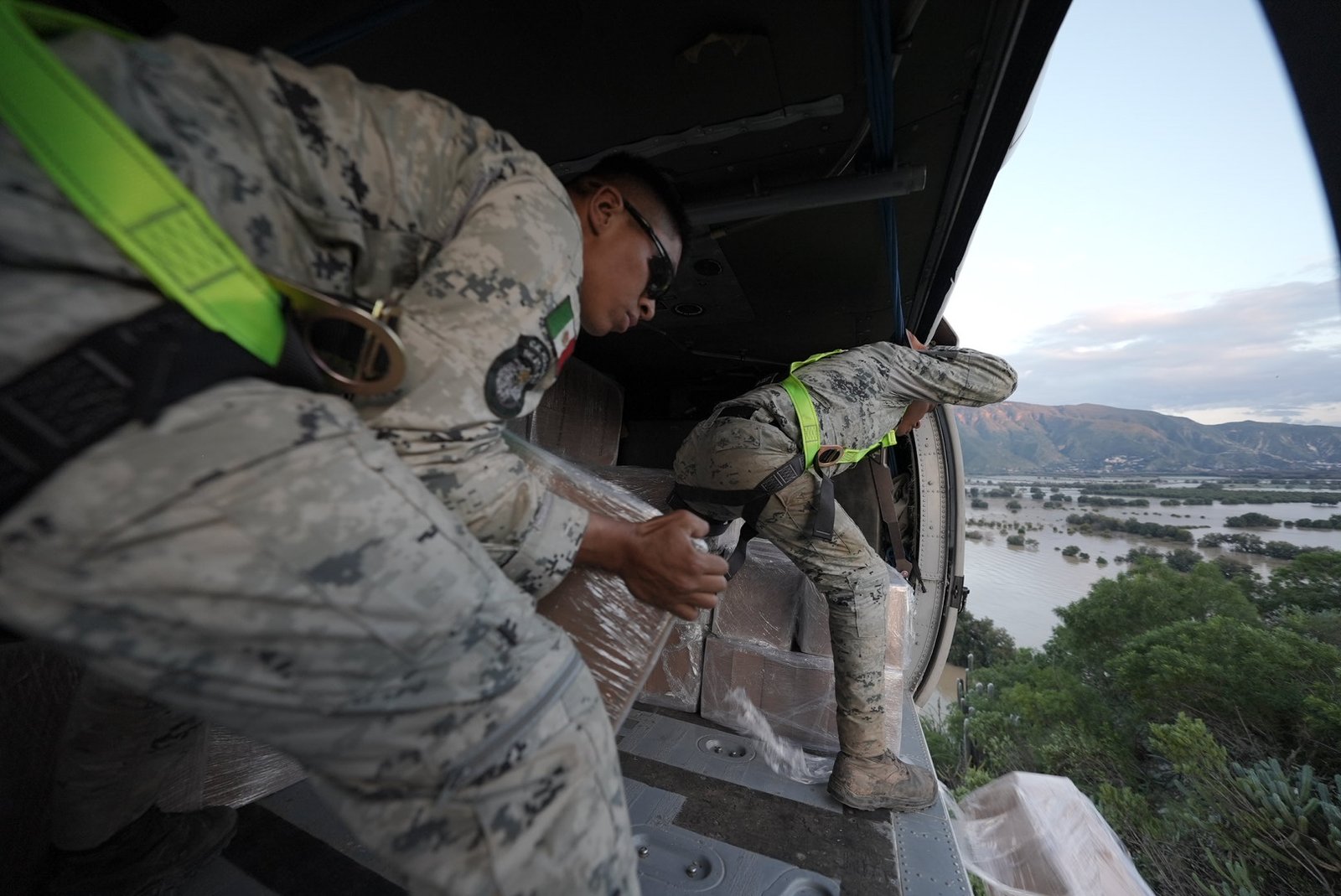 Los oficiales de descarga se anclan con arneses de seguridad para descender parcialmente de la aeronave y liberar las despensas, evitando poner en riesgo a la población que las recibe.