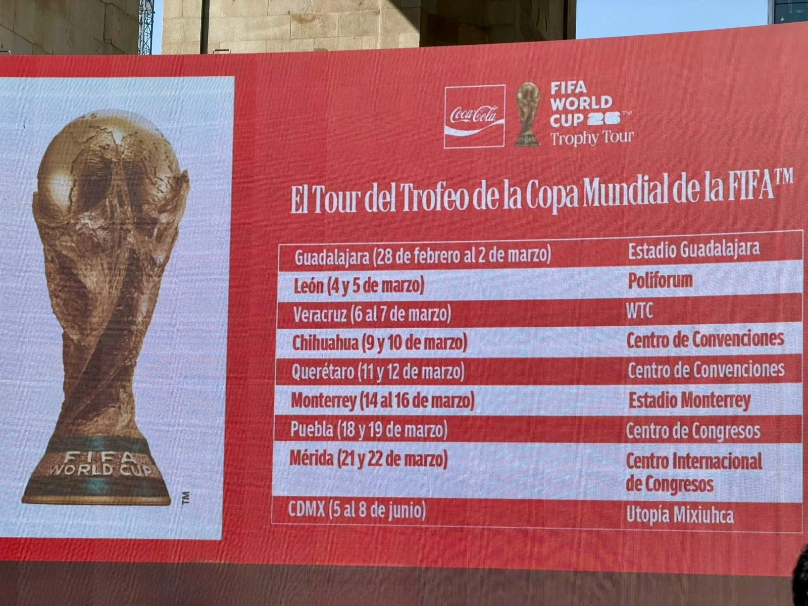 El Tour del Trofeo de la Copa Mundial de la FIFA, presentado por Coca-Cola, confirmó su recorrido por territorio mexicano, el cual incluirá varias ciudades del país entre los meses de febrero y junio.