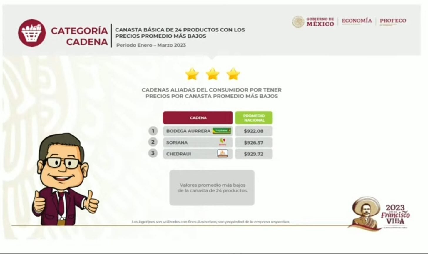 Y en segundo lugar Soriana con un precio de 926 pesos y, en tercer lugar, Chedraui con una canasta básica de 929 pesos.