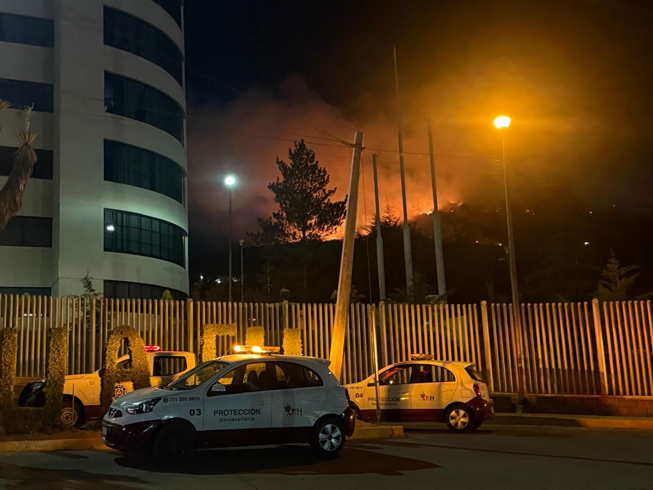 Por la noche, el incendio continuaba activo; sin embargo, las brechas cortafuego establecidas impedirían que las llamas alcancen las instalaciones universitarias.