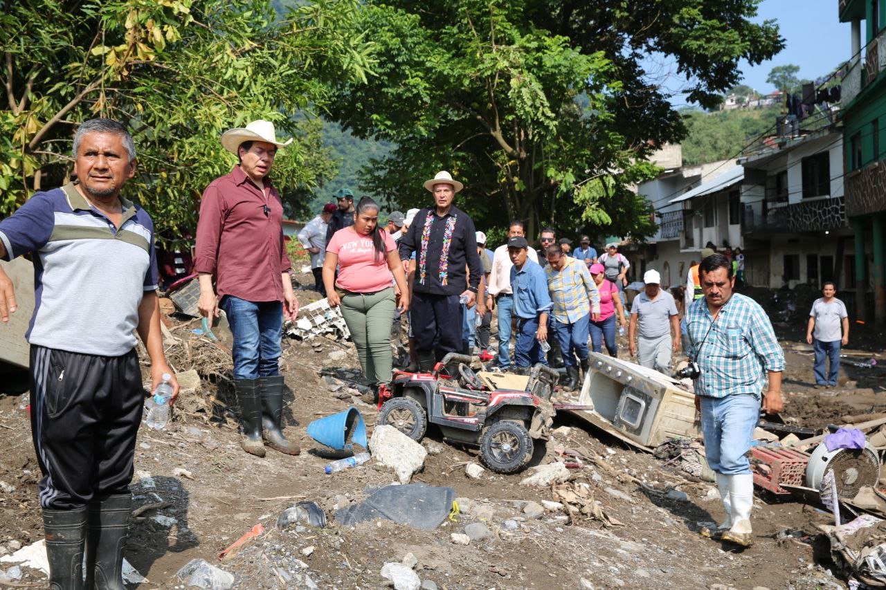 Mario Delgado y Natividad Castrejón recorrieron planteles en Huehuetla para evaluar daños y coordinar acciones de rehabilitación; suman 225 escuelas afectadas en Hidalgo