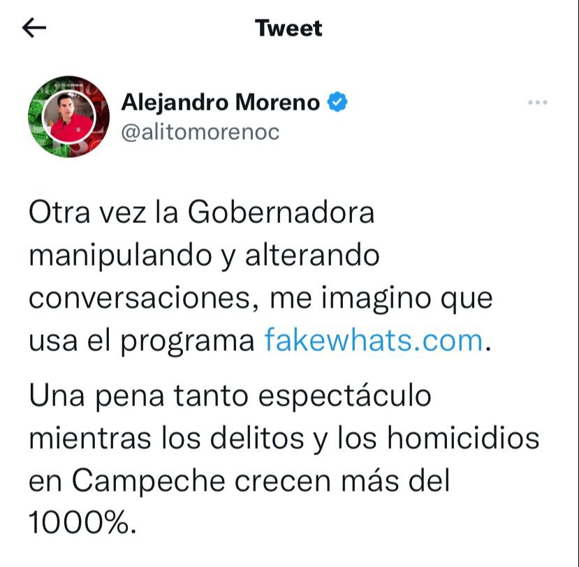 “Otra vez la Gobernadora manipulando y alterando conversaciones, me imagino que usa el programa fakewhats.com, Una pena tanto espectáculo mientras los delitos y los homicidios en Campeche crecen más de 1000%”, así reviró a través de sus redes sociales a lo hecho por Sansores.
