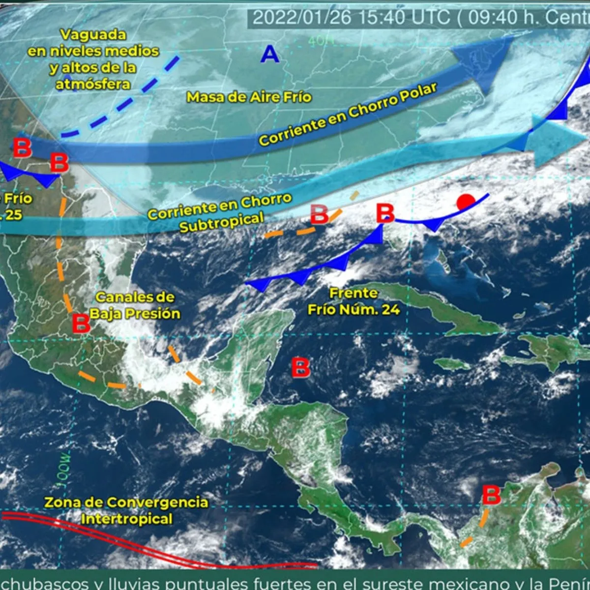 El Frente Frío Número 25 recorrerá el sureste del país y la Península de Yucatán, generando lluvias puntuales muy fuertes (de 50 a 75 mm) en Chiapas, el sur de Oaxaca, Tabasco y Veracruz; fuertes en Campeche y Puebla, y chubascos en Quintana Roo y Yucatán.