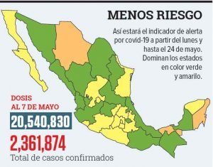 Durante la conferencia vespertina del viernes, la Secretaría de Salud informó que a partir del lunes 10 de mayo y hasta el 24 de mayo, habrá 14 estados en semáforo epidemiológico verde, lo que implica ver al país pintado de este color desde que empezara la pandemia.