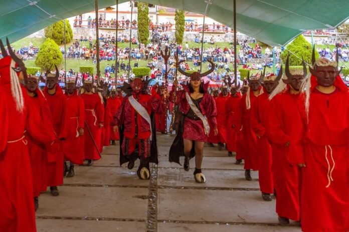 En Huejutla , el carnaval toma un giro místico al rendir homenaje a los seres del inframundo. Los participantes lucen tocados de plumas y máscaras de tela, culminando con la impactante danza de fuego, un ritual que invita al señor de las tinieblas a regresar al bajo mundo.