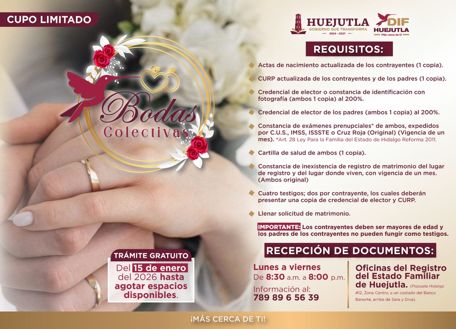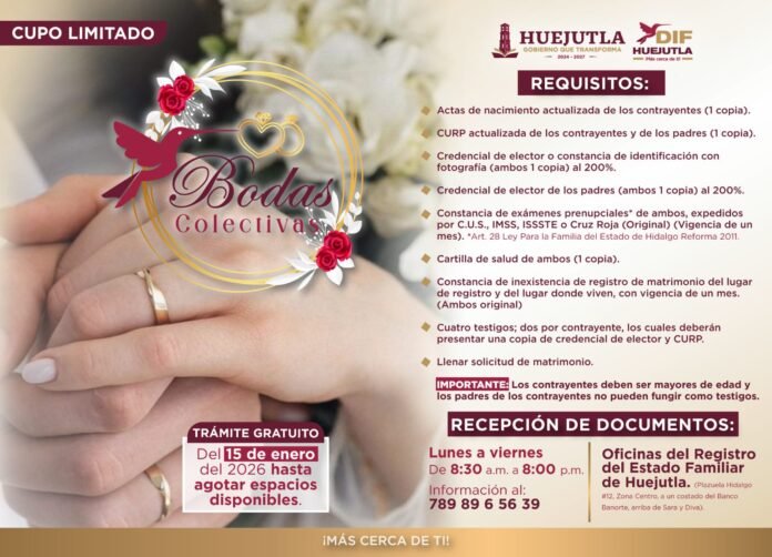 El Sistema DIF Huejutla, encabezado por la Dra. Kristel Rodríguez Flores, en coordinación con el Gobierno Municipal que preside el alcalde Alfredo San Román Duval, anunció la convocatoria para participar en las Bodas Colectivas 2026, dirigidas a personas mayores de 18 años que deseen formalizar su unión matrimonial.