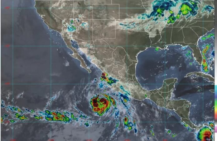 Trae rachas de viento de 70 a 80 kilómetros por hora (km/h) y oleaje de 2 a 4 metros (m) de altura en las costas de Colima, Jalisco y Michoacán, y rachas de 50 a 60 km/h y oleaje de 1 a 2 m de altura en el litoral de Guerrero.