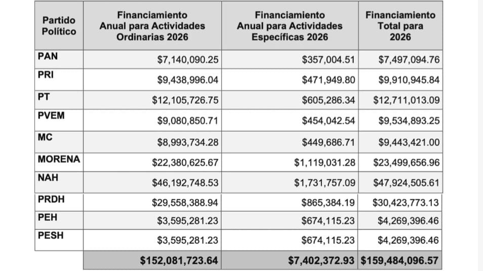 En cuanto al financiamiento partidista, el IEEH aprobó un total de $159,484,096.57 para el ejercicio 2026, de los cuales $152,081,723 se destinarán a actividades ordinarias permanentes y $7,402,372 a actividades específicas.