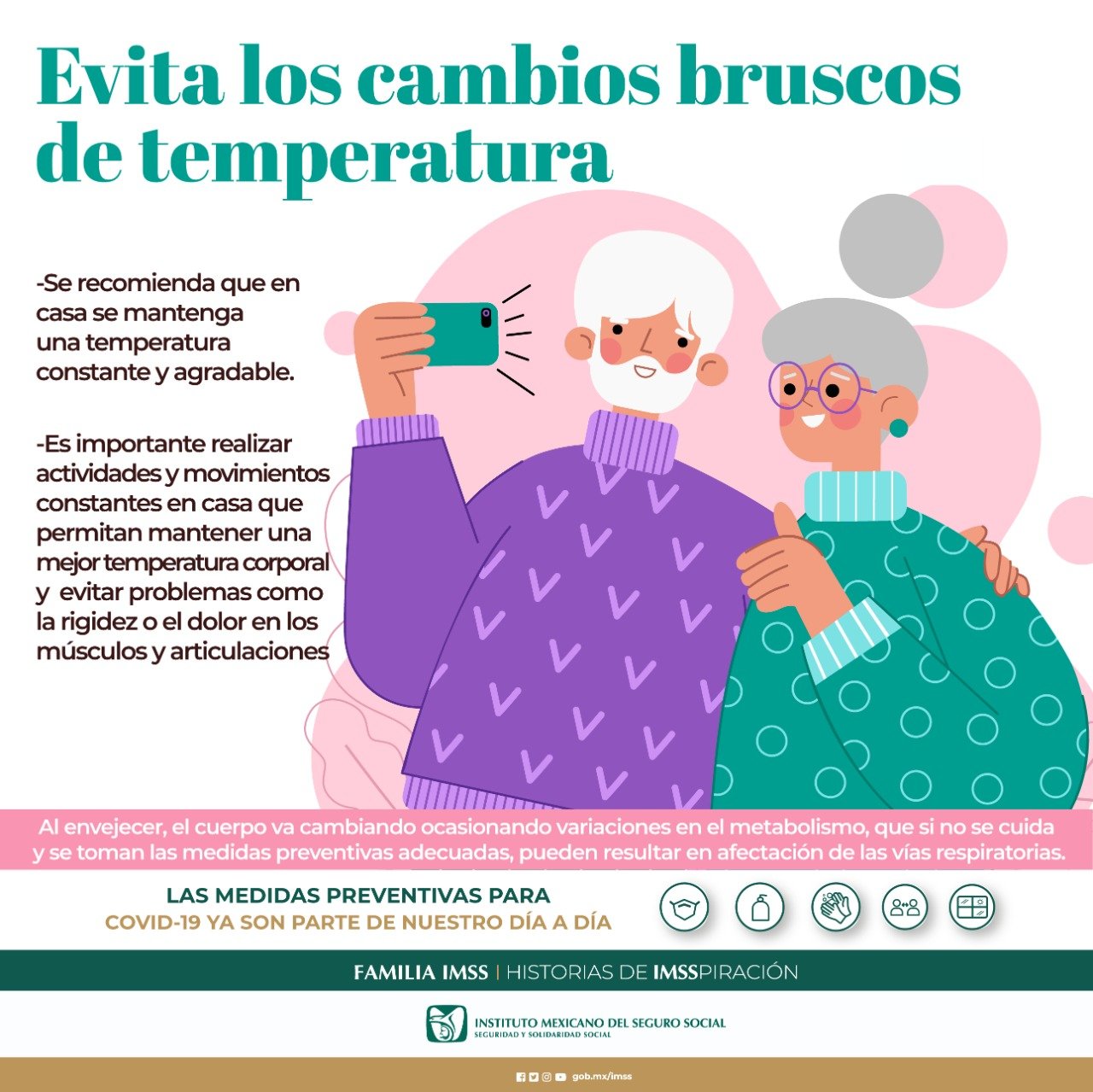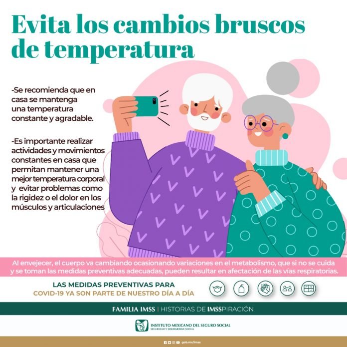 Pachuca de Soto, Hidalgo.- Conforme avanza la edad el proceso de envejecimiento causa cambios en el cuerpo y el sistema regulador que controla la temperatura corporal disminuye su efectividad ocasionando que los adultos mayores tengan problemas al exponerse a los cambios bruscos de temperatura, informó el Instituto Mexicano del Seguro Social (IMSS) en Hidalgo.