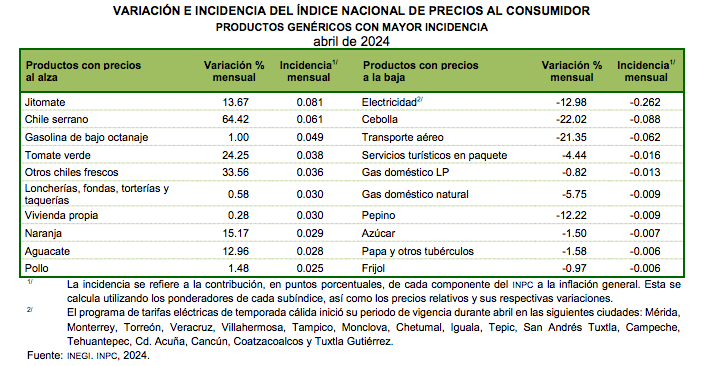 Sin embargo, el costo de los productos agropecuarios muestra su aumento de 2,32% en abril, a diferencia de los energéticos y las tarifas autorizadas por el gobierno que retrocedieron 1,64% debido a los ajustes en las tarifas eléctricas realizados por temporada cálida en 17 ciudades del país.