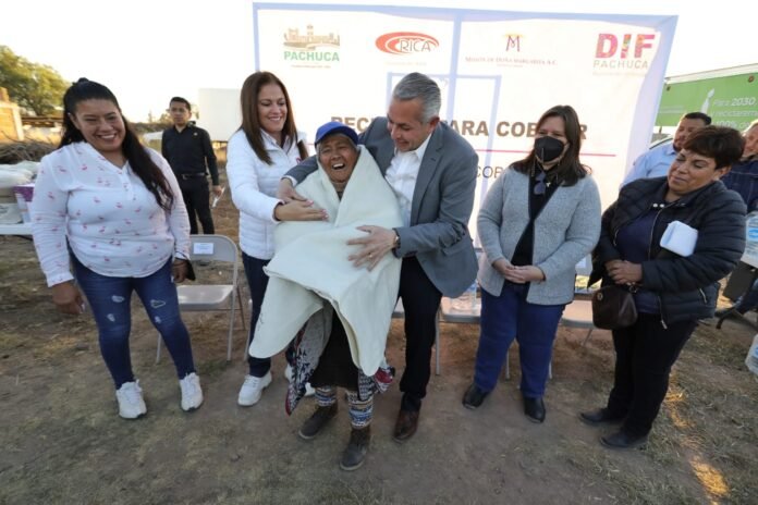 Pachuca de Soto, Hidalgo, 07 de diciembre de 2022.- El presidente municipal de Pachuca Sergio Baños Rubio y su esposa la presidenta del DIF Pachuca, Bárbara Montaño Sánchez Mejorada iniciaron la entrega de cobijas del programa «Reciclar para Cobijar», en la comunidad de Santiago Tlapacoya.