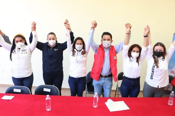 Durante la conferencia de prensa en el municipio de Tlaxcoapan, la candidata a diputada federal por el distrito V, Irene Soto, junto a Karina Mejía, candidata a diputada local por el distrito XIV y Paola Domínguez, secretaria general del PRI en Hidalgo, recibieron a Iván Vázquez López, candidato plurinominal del partido Nueva Alianza por el distrito local de Tula, quién refrendó su apoyo a la coalición Va por México.