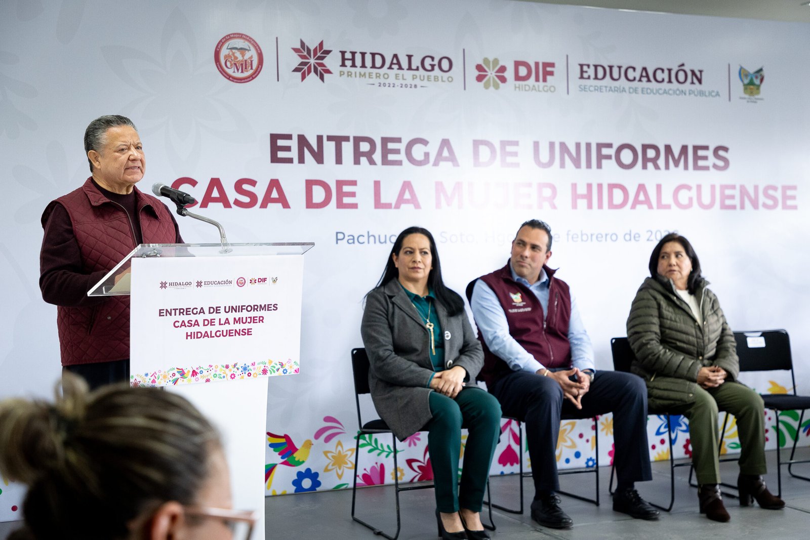 En compañía de la presidenta del Patronato del Sistema DIF Hidalgo, Edda Vite Ramos, así como de autoridades estatales, el gobernador encabezó la entrega simbólica de uniformes escolares para alumnas de distintos Centros de Asistencia Social, en las instalaciones de la Casa de la Mujer Hidalguense.