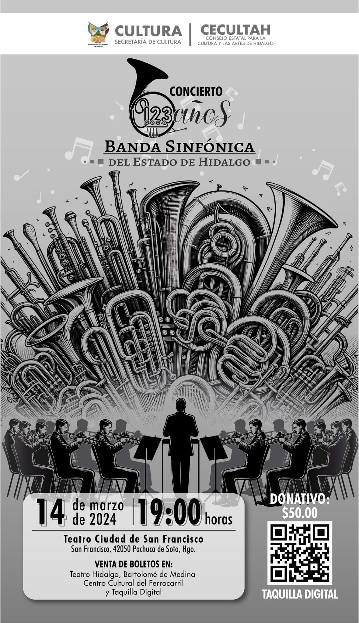 La Banda Sinfónica del Estado de Hidalgo (BSEH) invita a la población al concierto por su 123° Aniversario, el cual se realizará el próximo 14 de marzo, a las 19:00 horas, en el Teatro de la Ciudad San Francisco.