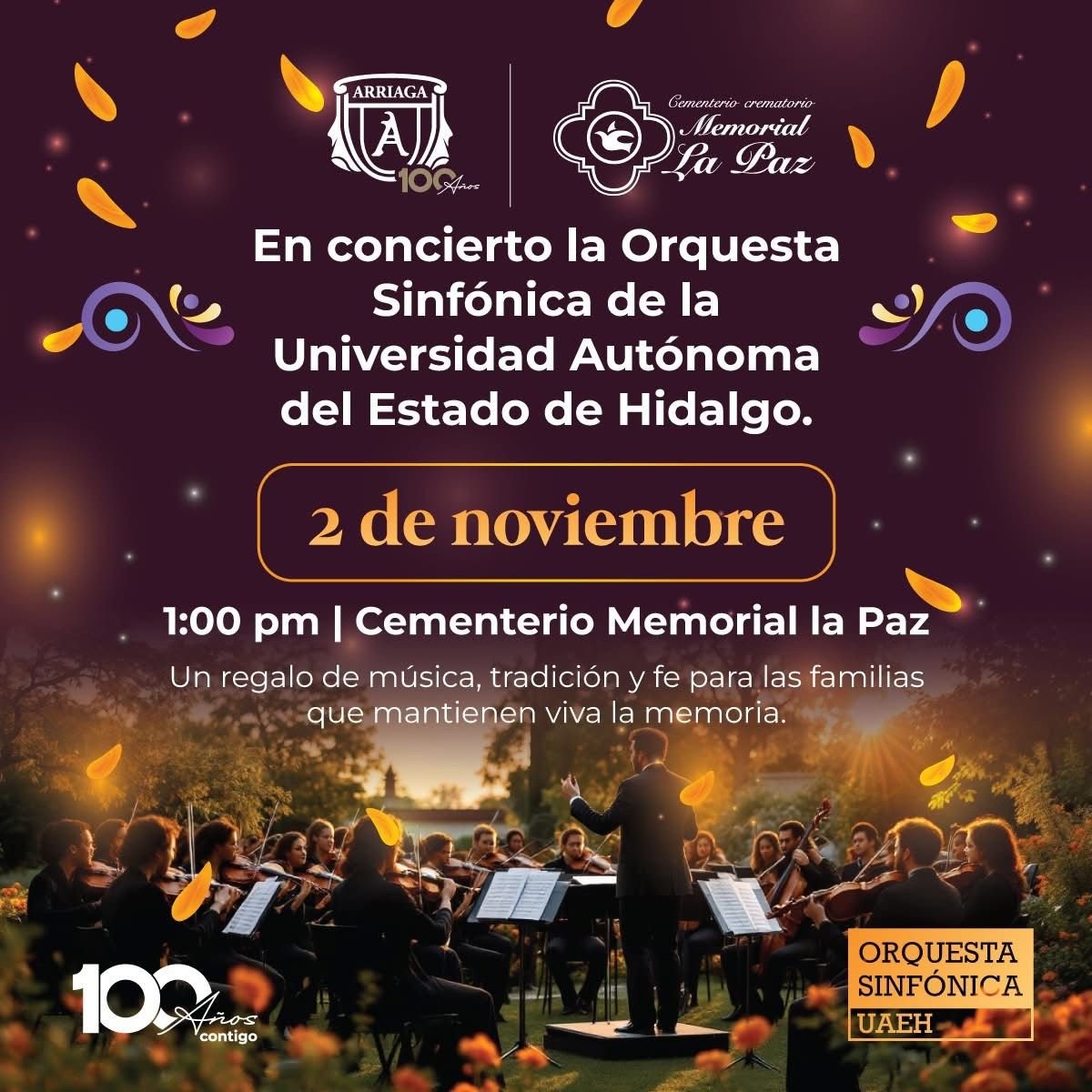 Con motivo del Día de Muertos, la Orquesta Sinfónica de la Universidad Autónoma del Estado de Hidalgo (OSUAEH) ofrecerá un concierto especial el 2 de noviembre a la 1:00 de la tarde en el Cementerio Memorial La Paz, con el propósito de celebrar la vida y recordar a quienes ya partieron.