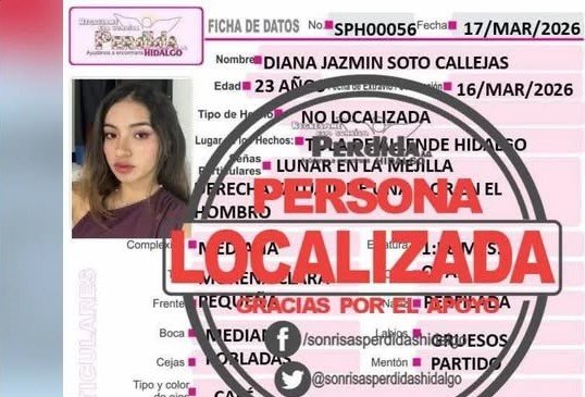 Diana Jazmín, de 23 años, quien había sido reportada como desaparecida el pasado 16 de marzo tras salir a correr en el municipio de Tula, fue localizada con vida en un terreno baldío de la comunidad de Pueblo Nuevo.