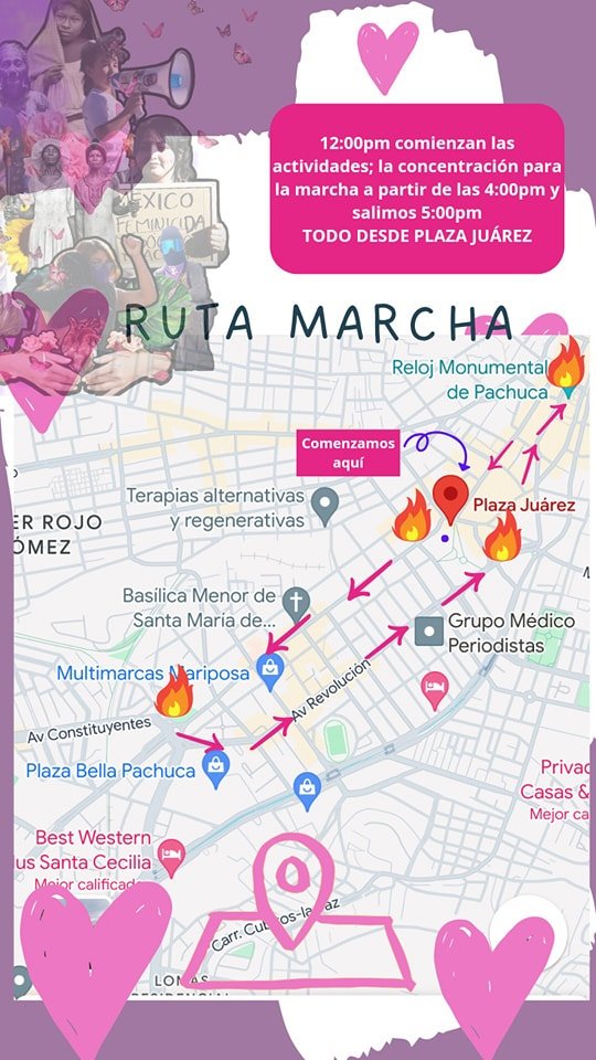 De acuerdo al itinerario que colectivas feministas hidalguenses compartieron a través de sus redes sociales, se llevarán a cabo distintas actividades previas a la marcha del 8M.